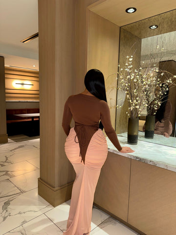 Where elegance meets edge. Our Amani Two-Tone Maxi Dress features a sleek, long-sleeve chocolate brown bodice that melts into a soft blush ruched skirt perfectly blending sophistication and allure. Designed with a flattering body-contouring silhouette that accentuates every curve, this dress moves effortlessly between classy dinner and luxe evening wear.