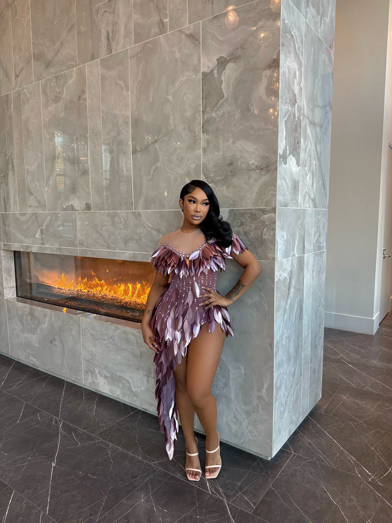 Turn every entrance into a moment with the Amethyst Siren Dress. Designed to command attention, this statement piece features an illusion mesh base adorned with layered petal detailing and delicate crystal embellishments that shimmer with every step. The asymmetrical hemline creates dramatic movement, while the sculpted fit hugs your curves in all the right places for a bold yet elegant finish.
