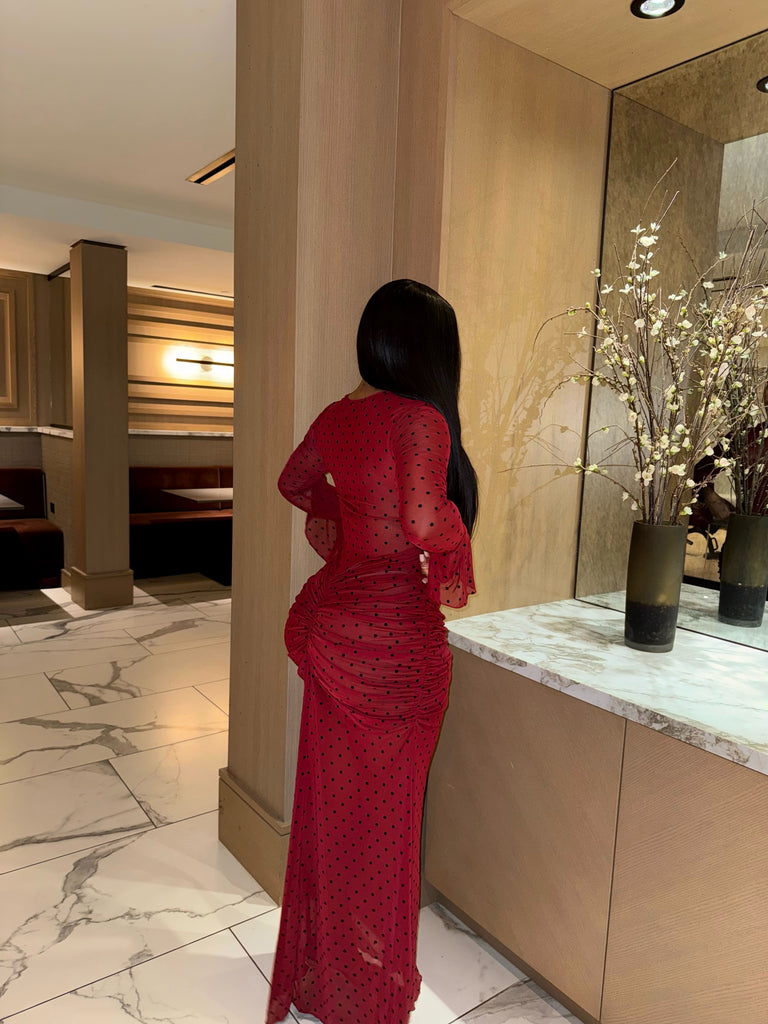 Turn heads and steal the spotlight in our Ruby Mesh Maxi Dress, a bold, body hugging statement piece that exudes confidence and allure. Crafted from premium stretch mesh fabric, it features ruched detailing at the hips and subtle bell sleeves that add a touch of drama to every move.